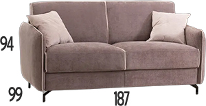 Il divano misura: lunghezza 187cm, profondità 99cm / aperto 209cm, altezza 94cm con piedini in metallo H.12 in nero opaco