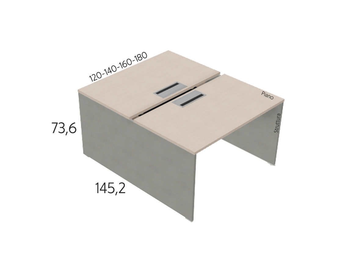 I piani di lavoro sono realizzati in pannelli di particelle di legno sp. mm 25 nobilitati in melaminico e bordati perimetralmente in ABS mm 2 in tinta con la superficie e disponibili nei colori: ROVERE 03, NOCE CLASSICO 07, ROVERE NATURALE 09, NOCE MODERNO 13, ROVERE NIAGARA 31, GRIGIO 38, STONE GREY 44, PIOPPO MORO 63, PIOPPO LIGHT 64, BIANCO 68. I fianchi sono realizzati in pannelli di particelle di legno sp. mm 25 nobilitati in melaminico e bordati perimetralmente in ABS mm 2 in tinta con la superficie e disponibili nei colori: ROVERE 03, NOCE CLASSICO 07, ROVERE NIAGARA 31, GRIGIO 38, STONE GREY 44, NERO 59, BIANCO 68. Le schiene sono realizzate in pannelli di particelle di legno spess. mm 18 nobilitati in melaminico e bordati perimetralmente in ABS mm 0,45 in tinta con la superficie e disponibili nei colori: ROVERE 03, NOCE CLASSICO 07, ROVERE NIAGARA 31, GRIGIO 38, STONE GREY 44, NERO 59, BIANCO 68. Tra i piani di lavoro e i fianchi delle scrivanie viene applicato un distanziale di spessore mm 4 realizzato in ABS. I fianchi sono completi di scarpette in ABS che permettono l’innesto di piedini registrabili. I piani dei bench pannellati sono da completare sempre con top-access forniti separatamente. Nella parte sottostante vengono montate delle vaschette