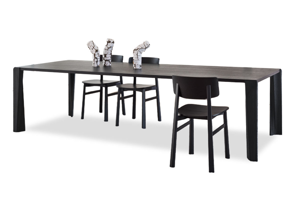 Dinamismo e tensione. Interamente realizzato in essenza, il tavolo Enea Up di Pianca si distingue per le particolari geometrie che ne valorizzano il design e la materia. Il piano è caratterizzato da un bordo sagomato smussato a 45°: la peculiare lavorazione del rivestimento permette alla venatura del legno di avvolgere ogni lato, in una continuità materica e visiva che sottolinea ed esalta l’effetto piega e l’apparente plasticità delle superfici.Le gambe, realizzate a partire da una figura sagomata rivestita in tranciato di legno, nascono da una lavorazione simile al folding: il risultato è una gamba iconica e caratterizzante, enfatizzata dalle venature lignee.